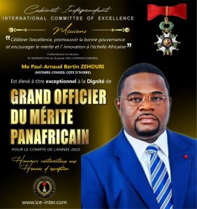 Par décision N°0029/PCC-08-2023 du 11 Aout 2023 à KIGALI, Maitre Paul Bertin Arnaud ZEHOURI, Notaire a été désigné Lauréat du Grand Prix du Mérite Panafricain 2023 dans la catégorie « Meilleures Pratiques Notariales » Cette Prestigieuse distinction Panafricaine reçue le